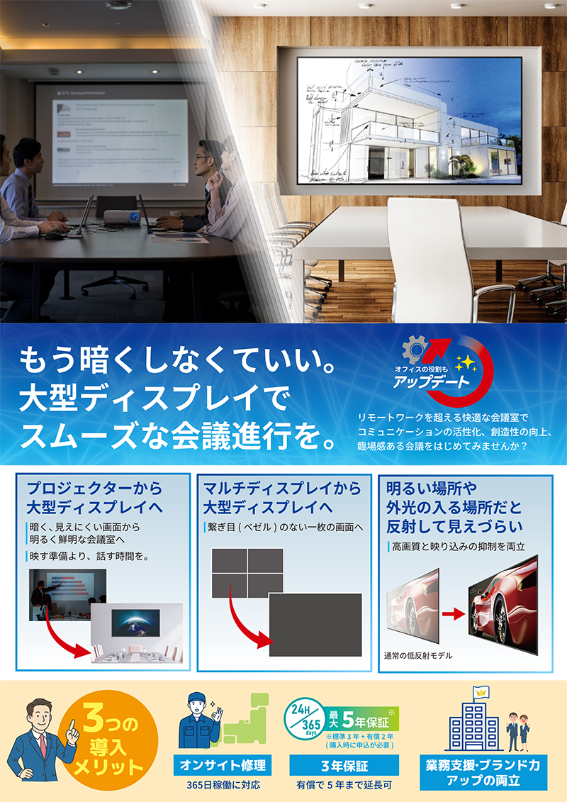 大型ビジョン、スタンドタイプ、壁面設置、マルチディスプレイ構成など、柔軟な構成提案でご要望に応えます。