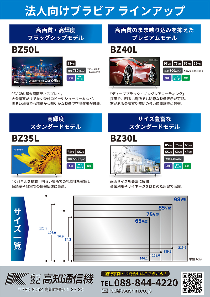 屋内では高精細な大型モニターを活用した映像演出や案内表示、屋外では耐候性・高輝度に優れたモデルによるPRや防災情報発信など、目的に応じたご提案が可能です。